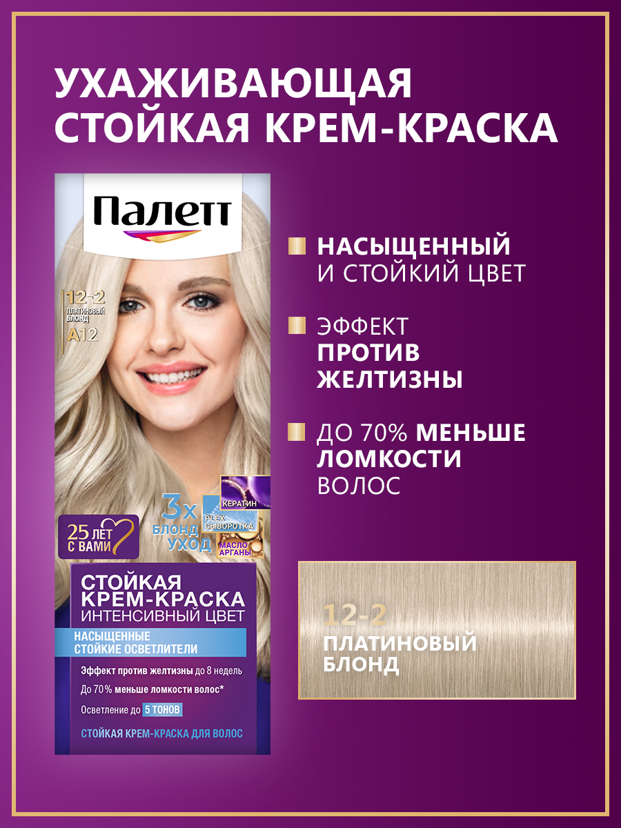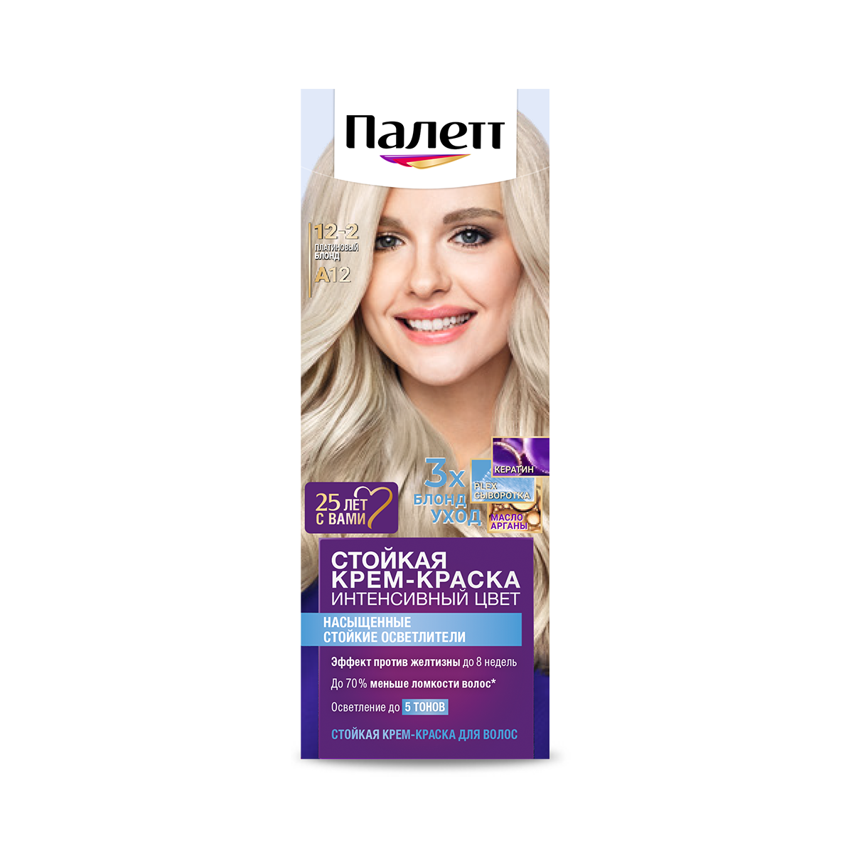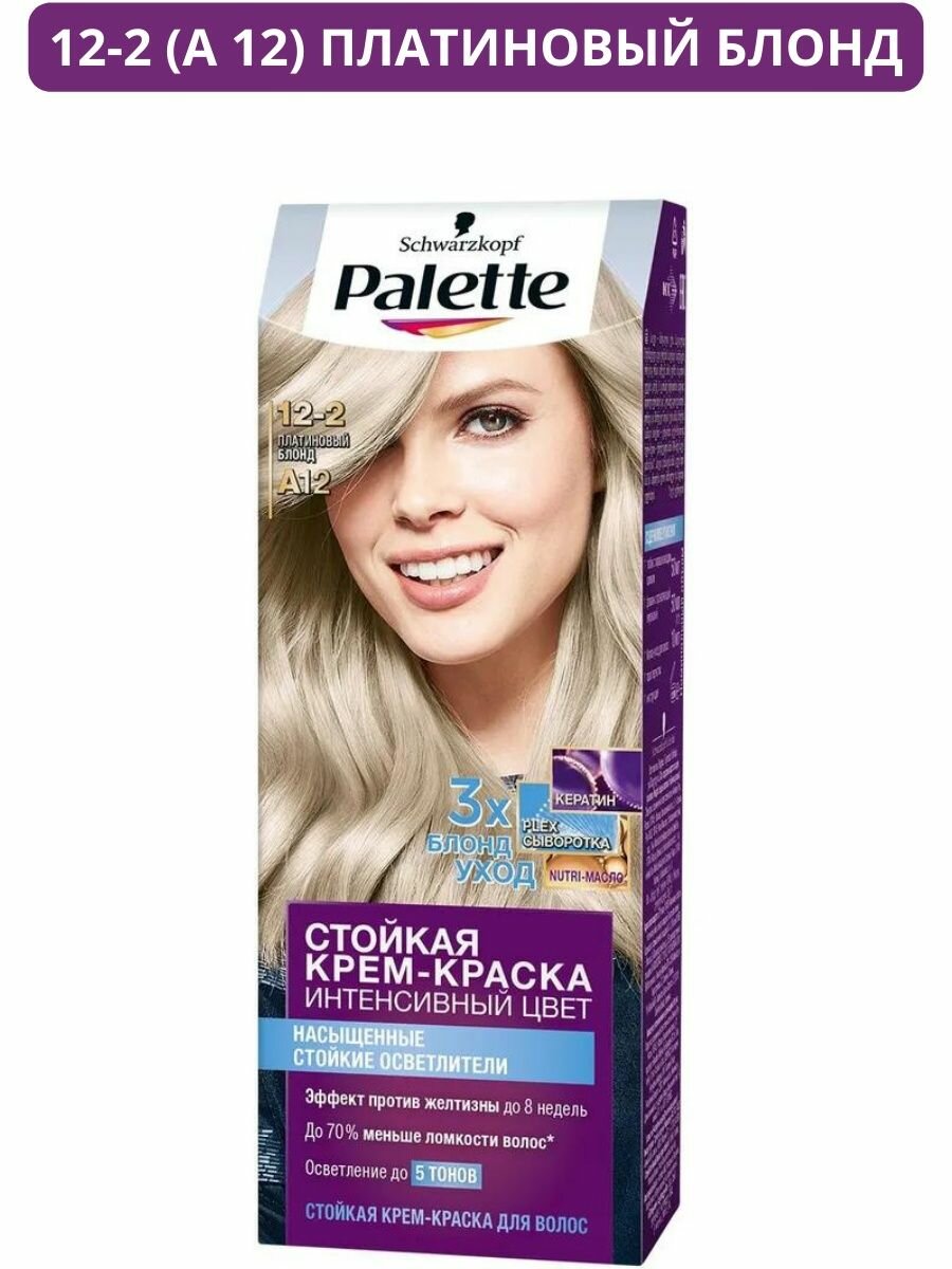 Палетт Стойкая крем-краска Интенсивный цвет, Осветлители, A12 12-2 Платиновый блонд, 110 мл - 1 шт