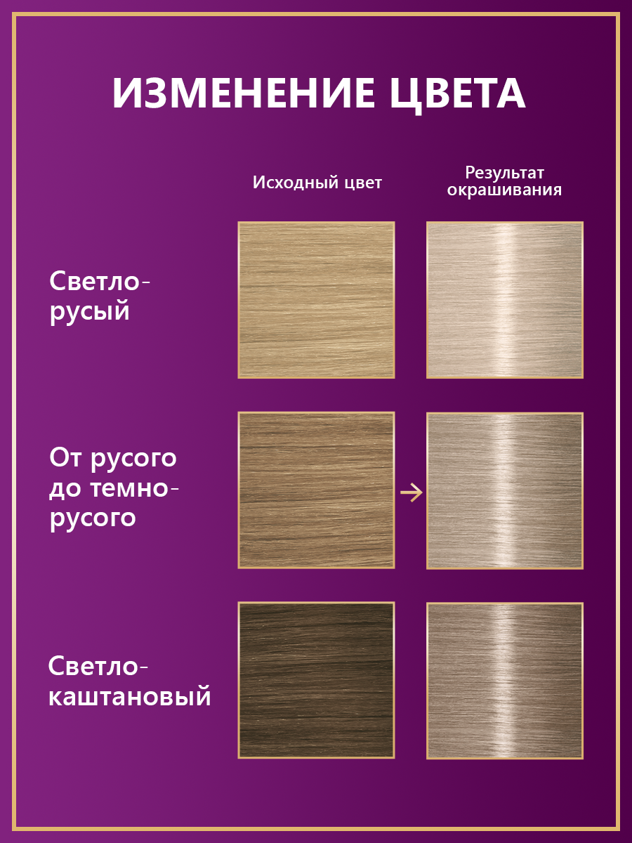 | Состав | окрашивающий крем: aqua, cetearyl alcohol, ammonium hydroxide, glyceryl stearate, ceteareth-20, octyldodecanol, sodium laureth sulfate, sodium cetearyl sulfate, serine, simmondsia chinensis seed oil, parfum, oleic acid, potassium stearate, glycerin, tetrasodium edta, carbomer, potassium hydroxide, ascorbic acid, linoleamidopropyl pg-dimonium chloride phosphate, propylene glycol, sodium sulfate, проявляющая эмульсия: aqua, paraffinum liquidum, hydrogen peroxide, cetearyl alcohol, peg-40 castor oil, sodium cetearyl sulfate, etidronic acid, potassium hydroxide, 2,6-dicarboxypyridine, disodium pyrophosphate, sodium benzoate, кондиционер: aqua, cetearyl alcohol, quaternium-87, hydrolyzed keratin, panthenol, prunus armeniaca kernel oil, niacinamide, stearamidopropyl dimethylamine, ceteareth-20, propylene glycol, isopropyl myristate, distearoylethyl hydroxyethylmonium methosulfate, citric acid, phenoxyethanol, parfum, glyceryl stearate, sodium methylparaben, hexyl cinnamal, butylphenyl methylpropional |