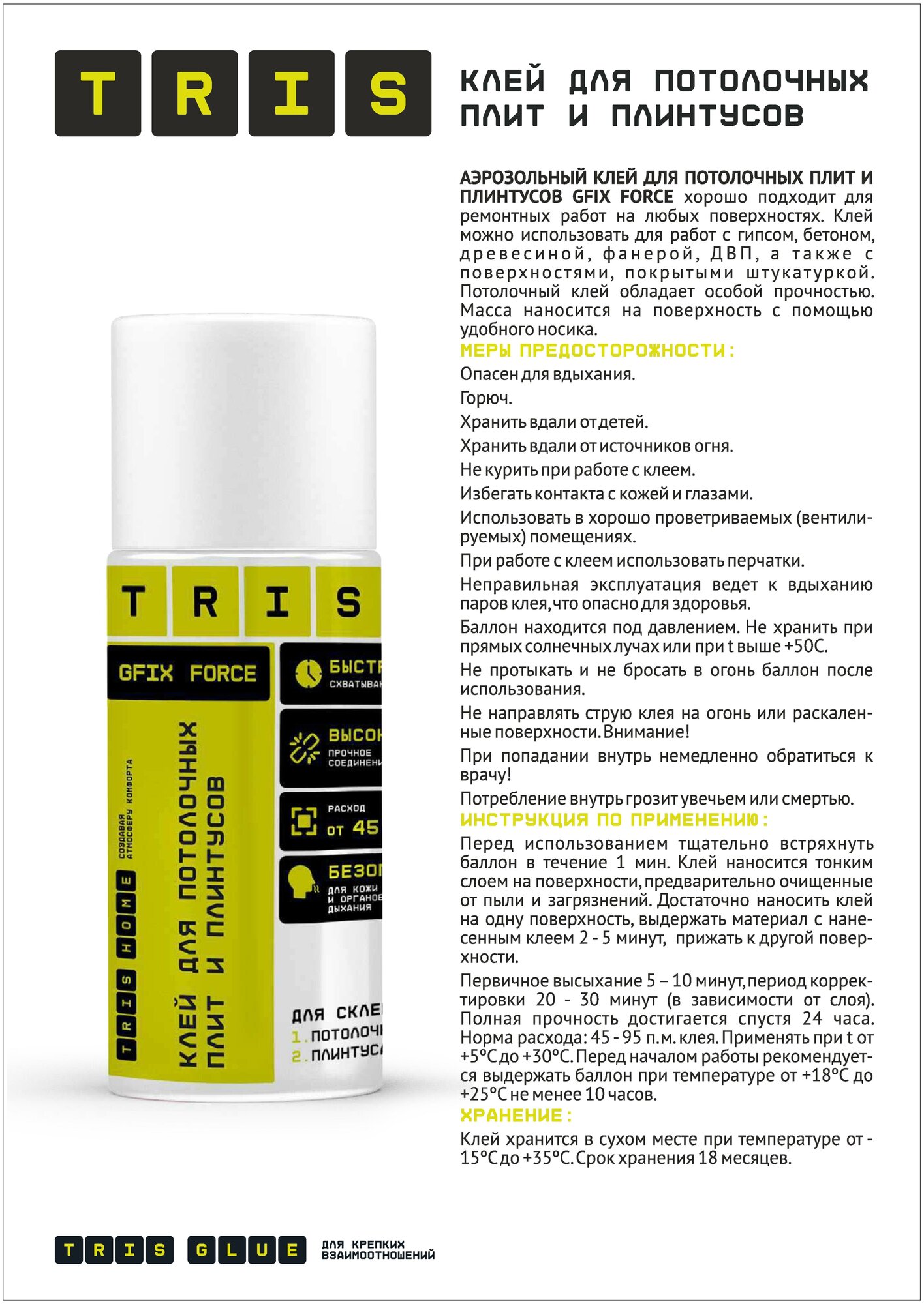 СохранитьКлей для потолочных плит и плинтусов спрей GFIX FORCE Полимерный клей для полистирола, линолеума, ковровых покрытий, паркета, керамики, стекла, дерева, кожи, асбеста и картона, 500 мл. TRIS интересное: