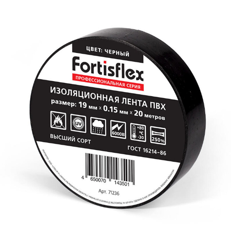 Изоляционная лента ПВХ Fortisflex 19 мм х 0.15 мм х 20 м, черная (71236)