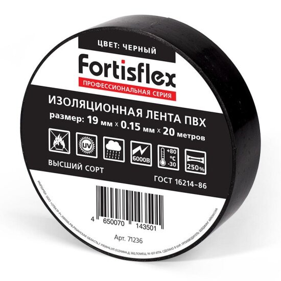 Изоляционная лента ПВХ Fortisflex 19 мм х 0.15 мм х 20 м, черная (71236)
