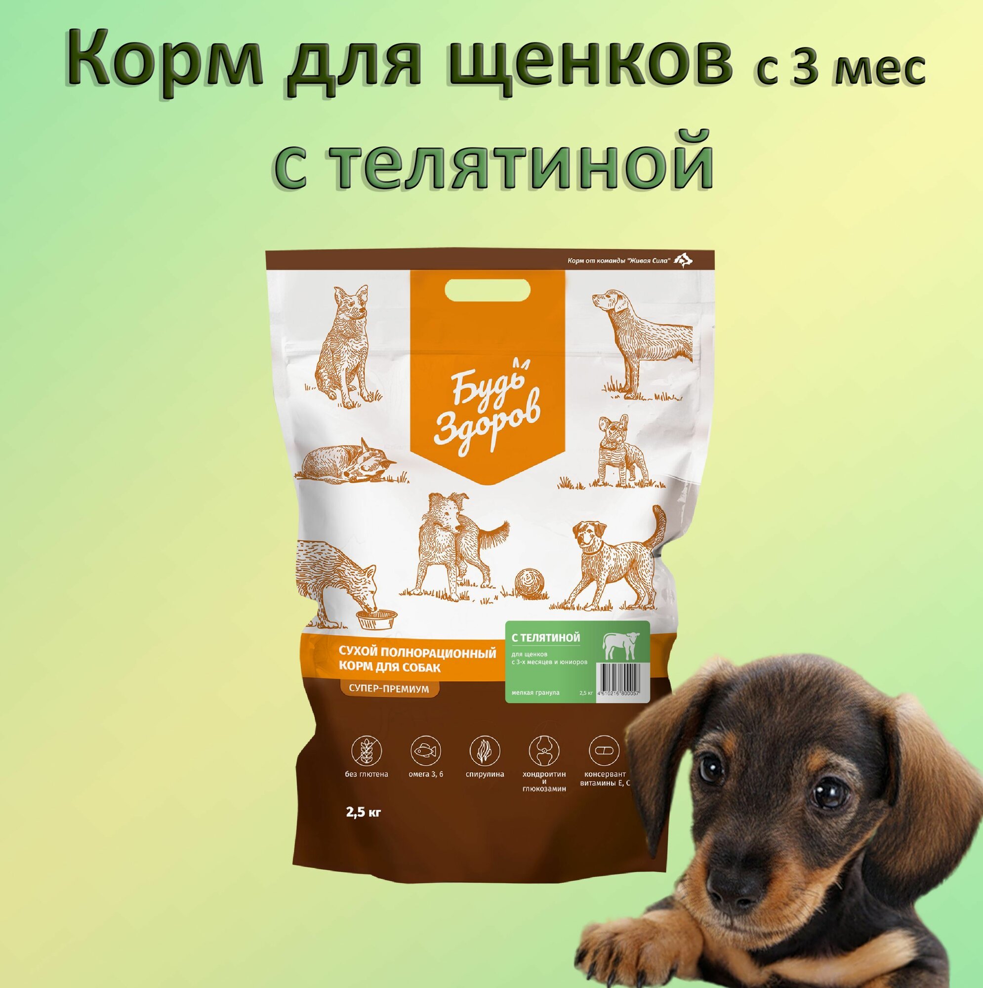 Купить Будь ЗДОРОВ_ЖИВАЯ сила Корм для щенков с 3-х месяцев и юниоров c телятиной, Мелкая гранула (2,5 кг)