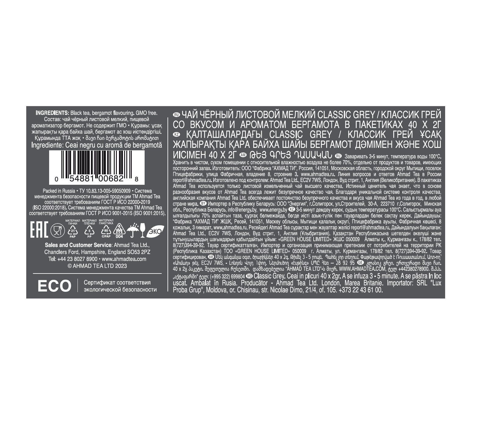 2425 Чай "Ahmad Tea", Чай Классик Грей, черный, пакетики с ярлычками, 100х1,9г