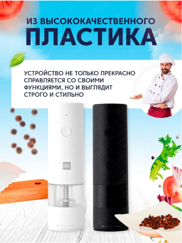 | Дополнительная информация | перезаряжаемая, работает от аккумулятора; разъём для зарядки USB Type-C; ёмкость аккумулятора 500 mAh; LED-подсветка; вмещает до 40 г специй; термостойкость (выдерживает 55°С в течение 48 ч); ударопрочный корпус (выдерживает падение с высоты 1 м), уровень шума до 68 дБ |