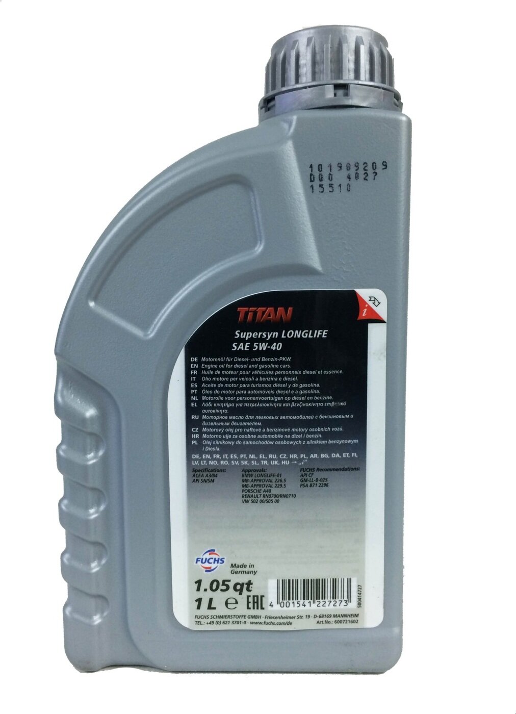 Ниже Вы можете прочитать отзывы на Моторное масло FUCHS Titan SuperSyn Longlife 5W-40, 1л, ознакомится с подробными характеристиками, посмотреть интересные обзоры и фотографии на Моторное масло FUCHS Titan SuperSyn Longlife 5W-40, 1л.