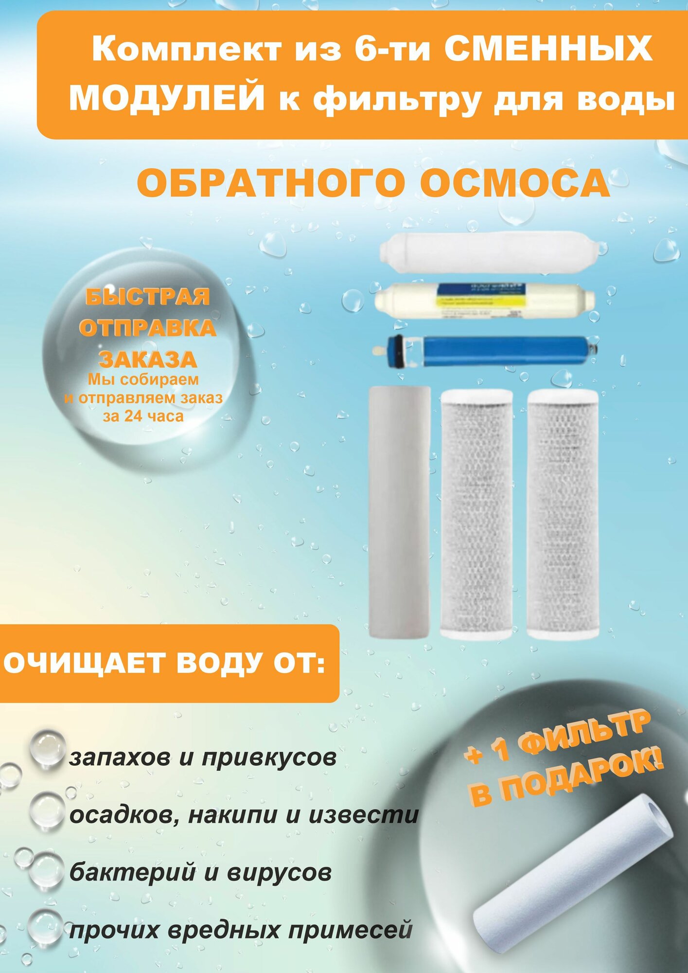 | Дополнительная информация | Комплектация: Полный комплект: 7 сменных модулей к фильтру обратного осмоса в заводской упаковке, стянутых прозрачной, стрейч-пленкой для безопасности перевозки в соответствии с требованиями площадки; Календарь замены фильтров - 1 шт. |