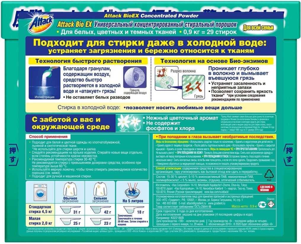 Kao attack bio ex стиральный био-порошок концентрированный универсальный, 0,9 кг.