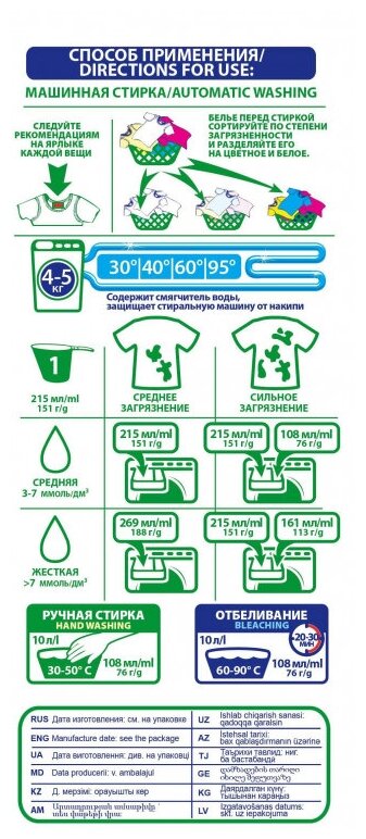 | Минусы: | Не отстирывает пятна(нужно застирывать или класть дополнительно пятновыводитель) |