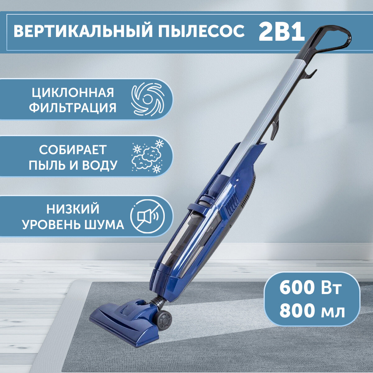 Пылесос вертикальный для дома 2 в 1 "Циклон" для сухой уборки, для сбора пыли и жидкости, для пола и для ковра