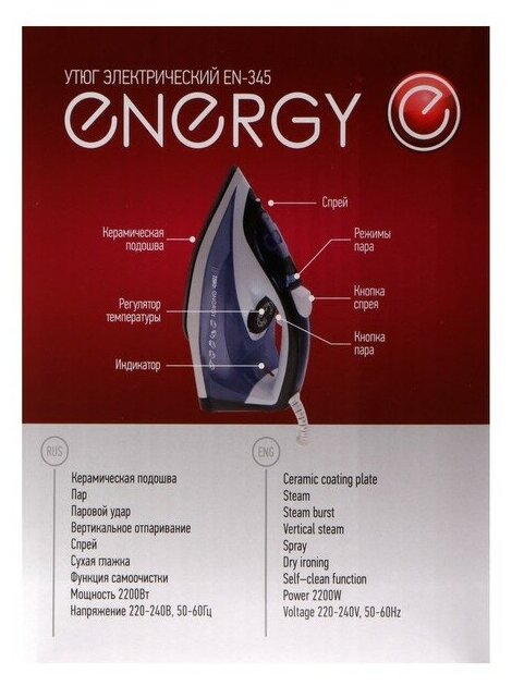 Утюг 2200ВТ керам. Покрытие С отпар самооч 270077 синий ENERGY - 00000177086 интересное: