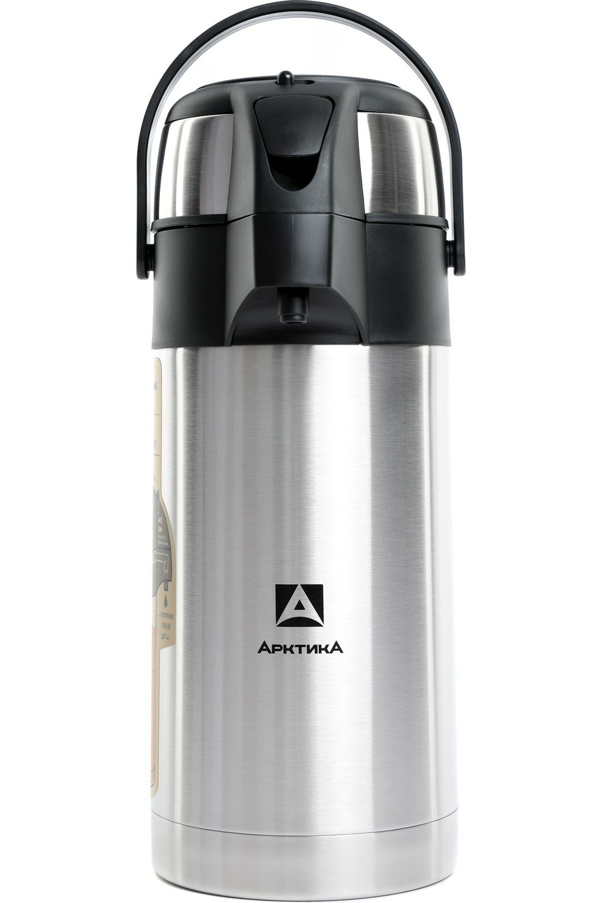 Термос для чая и кофе с помпой Арктика 501-2500 серебристый 2,5 литра настольный вакуумный с пневмонасосом и ручкой для переноски