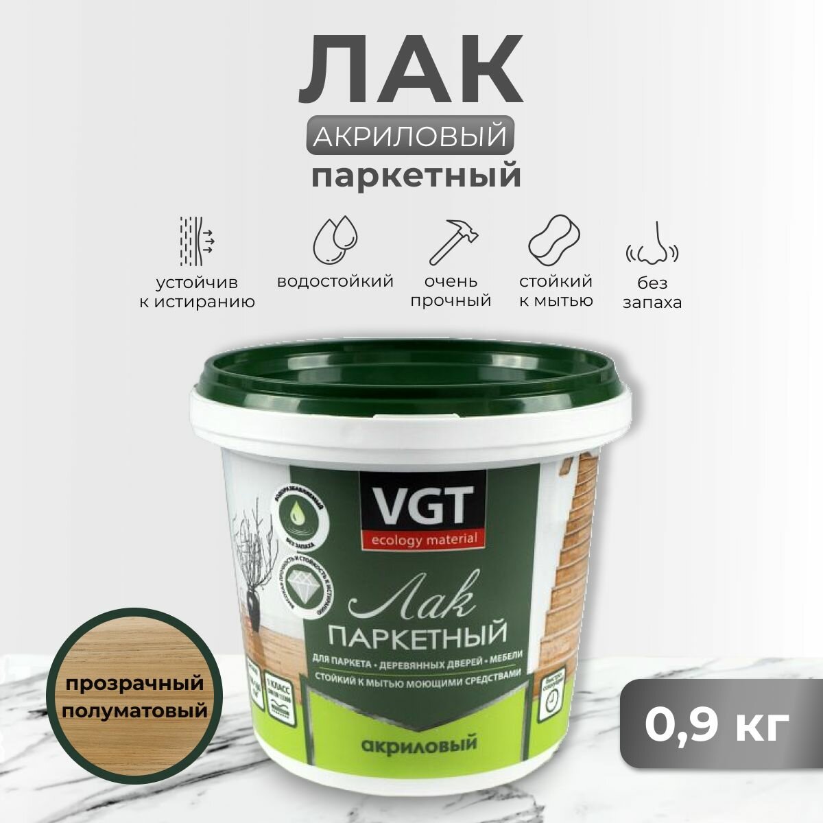 ВГТ лак по дереву акриловый паркетный полуматовый (0,9кг) / VGT лак по дереву акриловый паркетный полуматовый для пола и мебели внутри помещения (0,9к