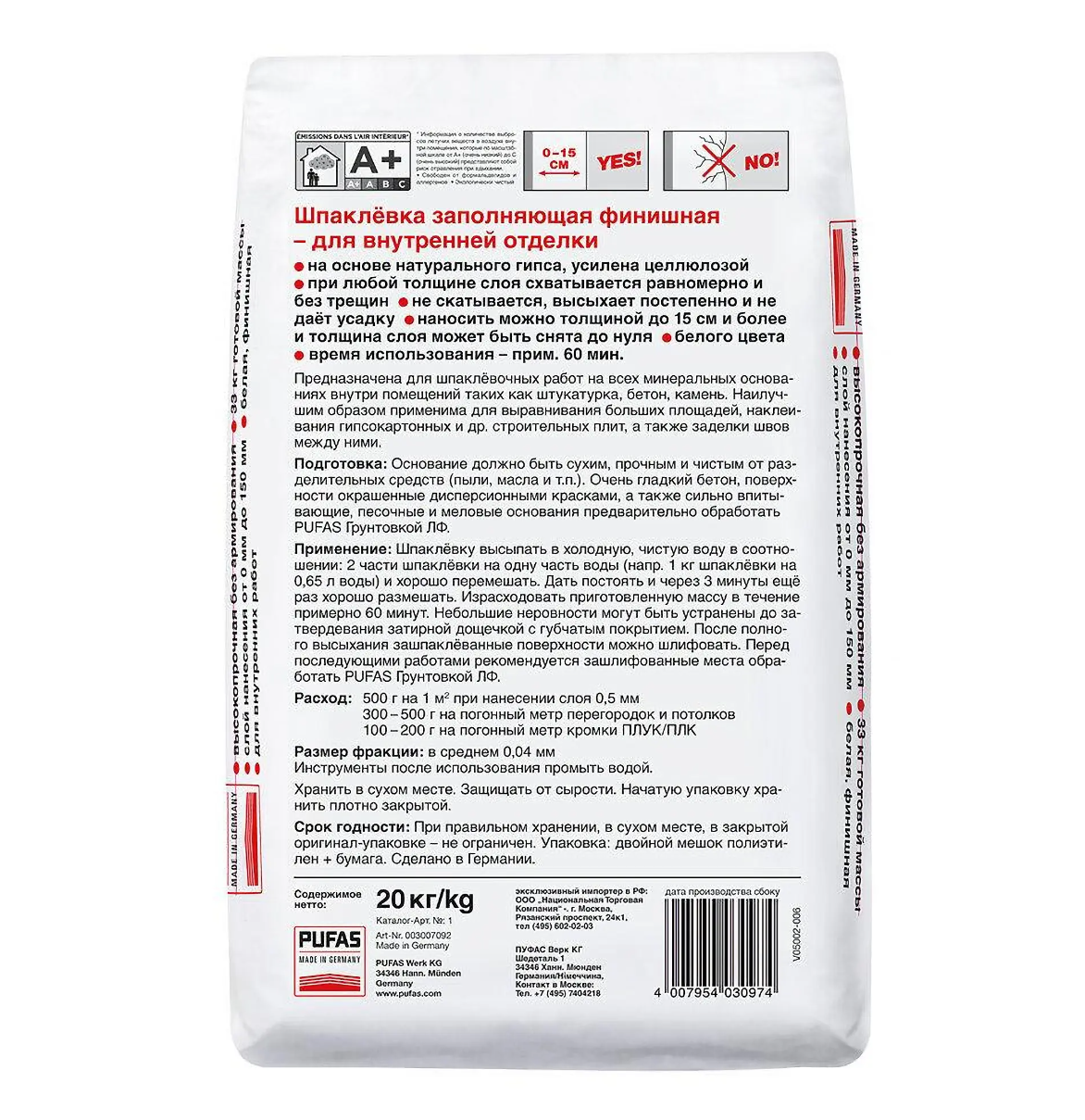 Пуфас N1 Фулл-Финиш шпатлевка гипсовая (20кг) / PUFAS N1 Full+Finish Spachtel шпаклевка гипсовая заполняющая финишная (20кг)