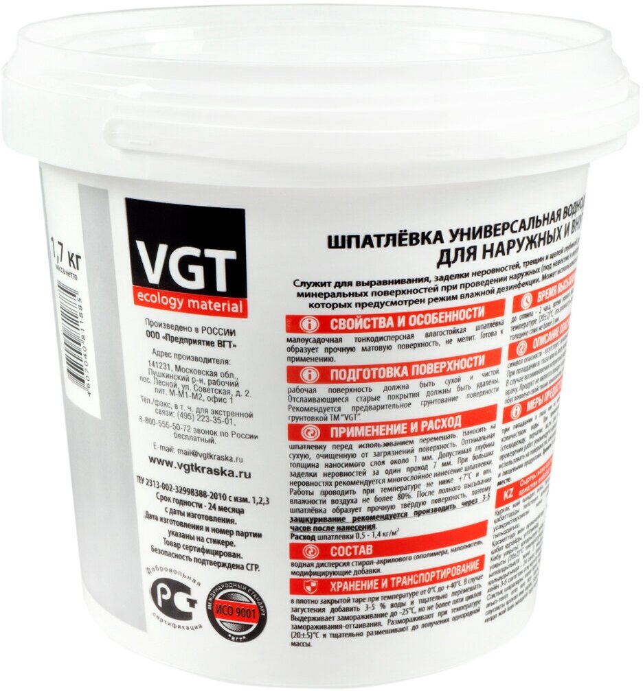 VGT ВГТ Шпатлёвка Универсальная акрил, для внутр, и наруж, работ 1,7кг,