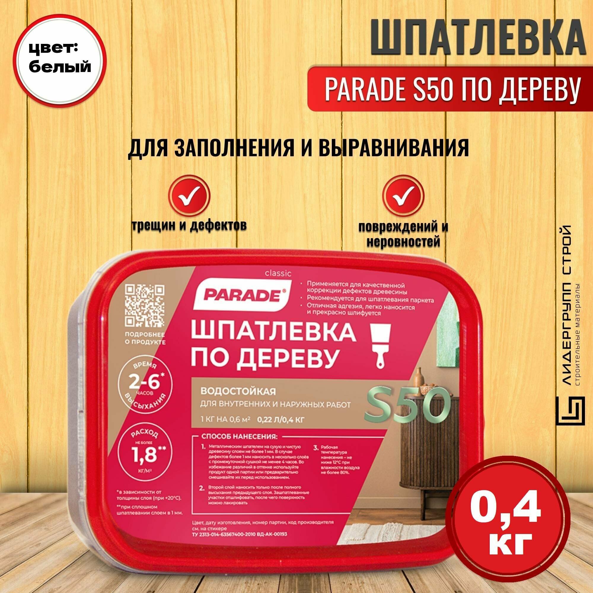 Шпатлевка по Дереву Parade S50 0.4кг Белый Водостойкая для Заполнения и Выравнивания Трещин.