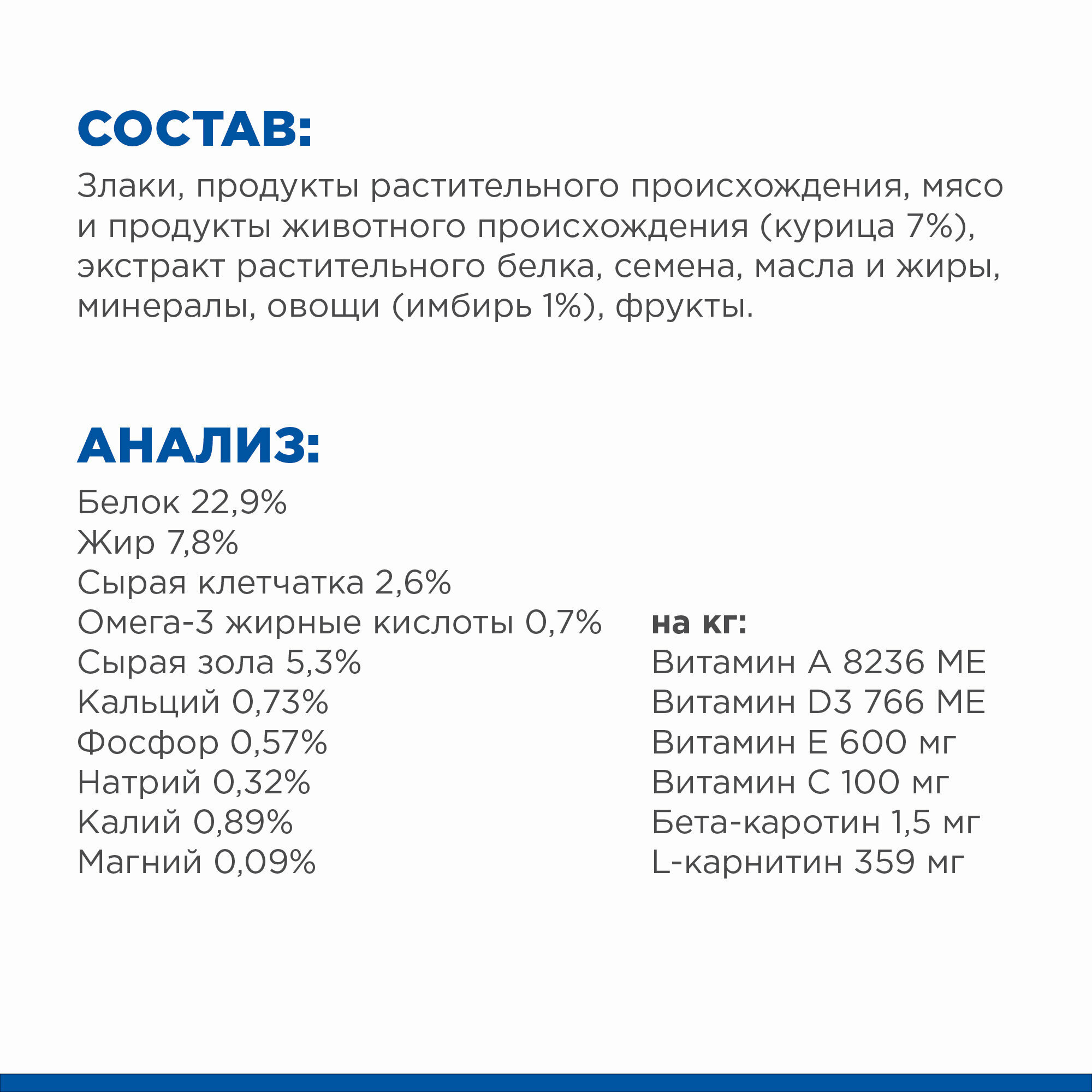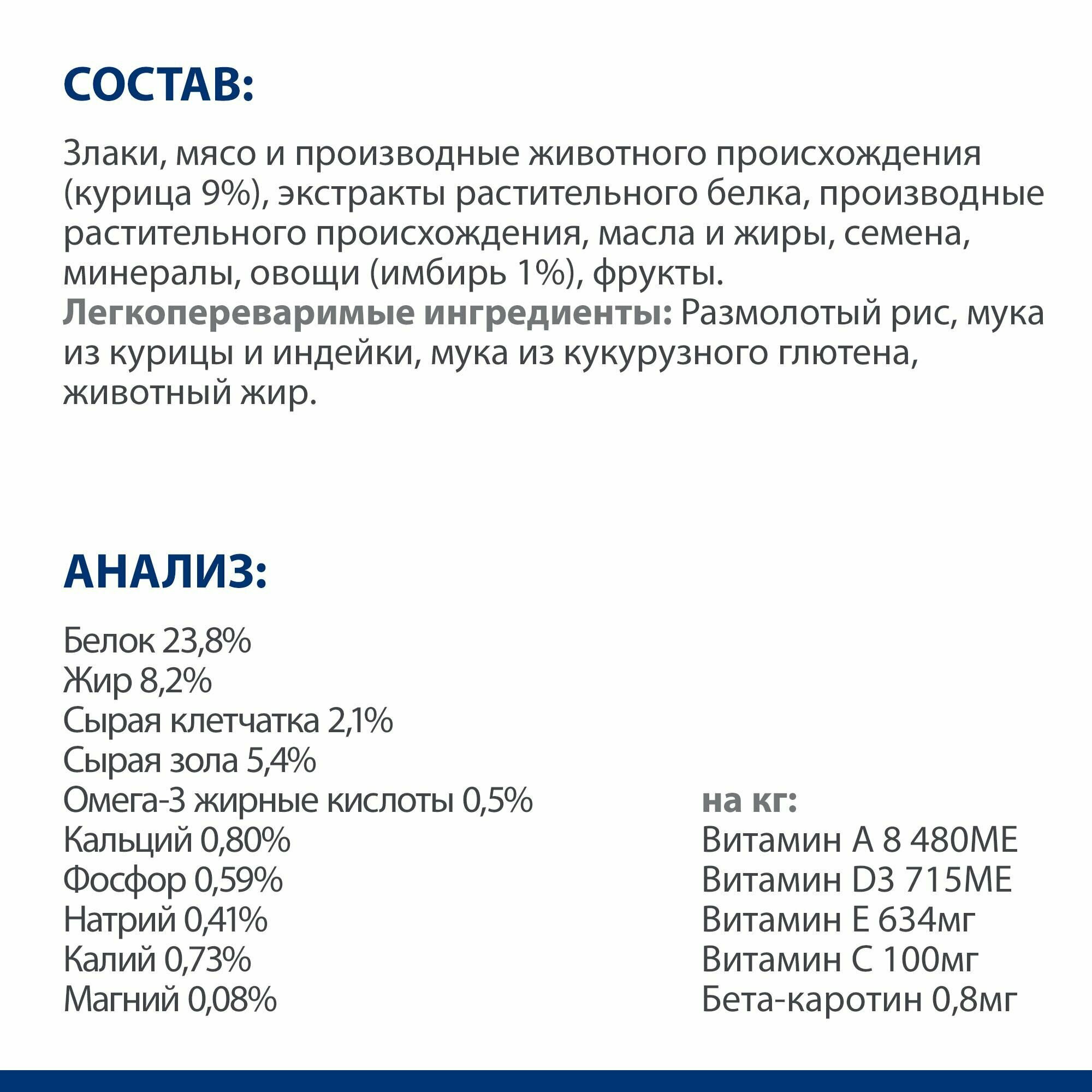 | Состав | злаки, производные растительного происхождения, мясо и производные животного происхождения (курица 7%), экстракты растительного белка, семена, масла и жиры, минералы, овощи (имбирь 1%), фрукты |