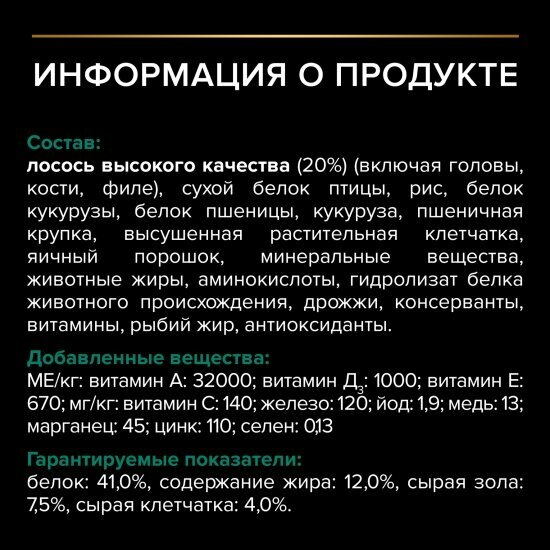 | Состав | лосось (20%), сухой белок птицы, рис, кукурузный глютен, кукуруза, пшеничный глютен, волокна пшеницы, клетчатка, яичный порошок, минеральные вещества, животный жир, аминокислоты, вкусоароматическая кормовая добавка, дрожжи, консерванты, витамины, рыбий жир, антиоксиданты |