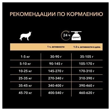 | Дополнительная информация | используйте таблицу для определения суточной нормы кормления вашей собаки; указанные нормы рекомендованы для поддержания собаки в оптимальной физической форме; меняйте суточную норму кормления в зависимости от уровня активности собаки, ее физических особенностей и индивидуальных потребностей; следите, чтобы у собаки всегда была чистая, свежая питьевая вода; для контроля здоровья вашей собаки обращайтесь в ветеринарную клинику на регулярной основе |