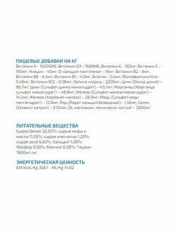 | Пищевая ценность | на 1 кг: влажность 8,00%, сырой протеин 32,00%, сырой жир и масла 11,00%, сырая клетчатка 1,20%, сырая зола 6,60%, кальций 0,98%, фосфор 0,85%, магний 0,08%, таурин 1800мг/кг |