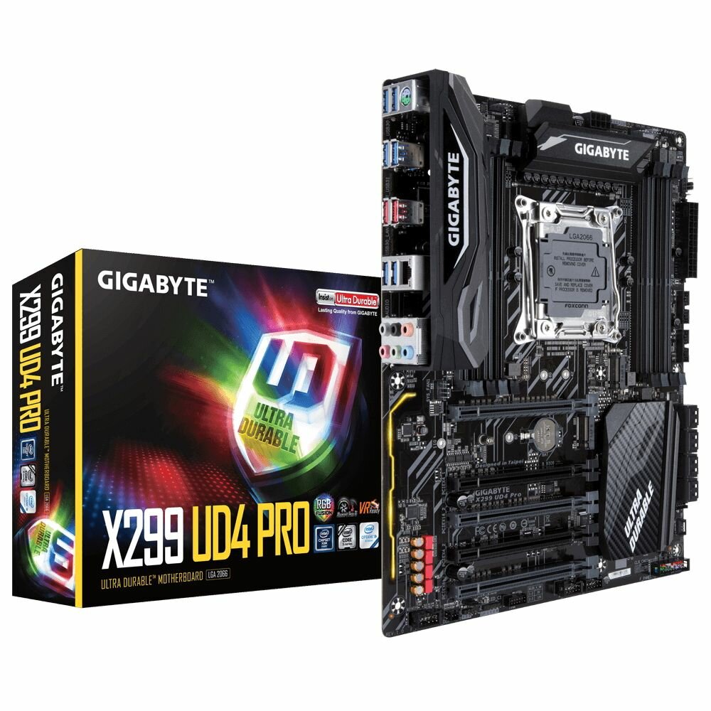 GIGABYTE X299 UD4 Pro // Socket 2066, Intel®X299, 8xDDR4-2400, 5xPCI-Ex16, 8xSATA3,(RAID 0/1/5/10), 2xM.2, 8 Ch Audio, GLan, (0+4)xUSB2.0, (8+4)xUSB3.1, 1xPS/2, ATX, RTL