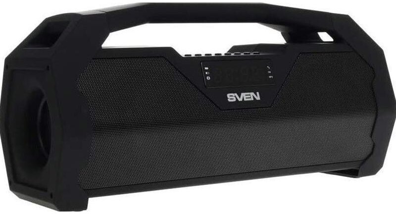 Sven PS-470 Портативная акустическая система чёрная (2x9W, USB, Bluetooth, micro SD, FM-радио, LED дисплей, часы, jack in, литий-ионный aккумулятор 1800 мAч)