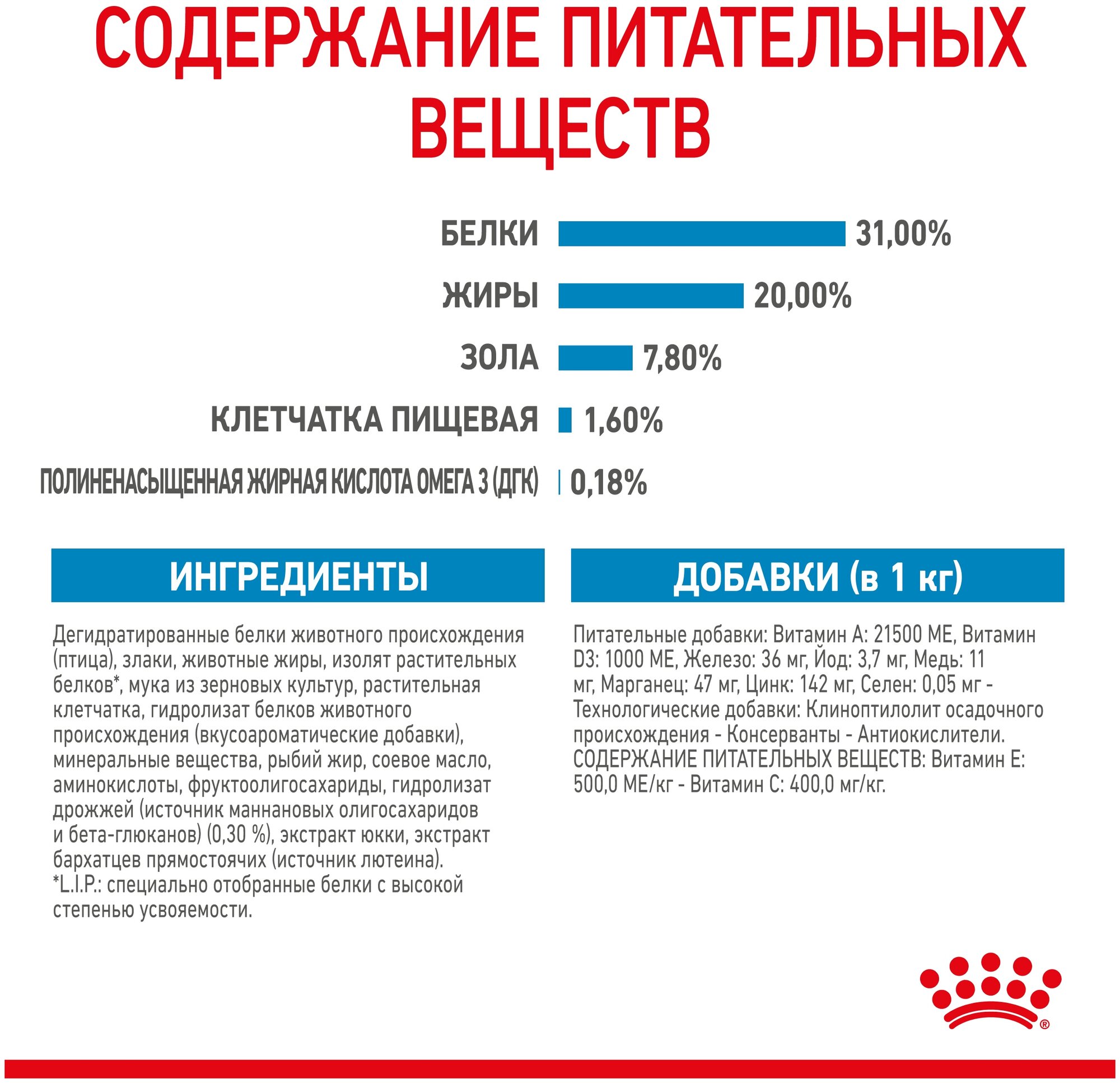 | Состав | дегидратированные белки животного происхождения (птица), злаки, животные жиры, изолят растительных белков*, мука из зерновых культур, растительная клетчатка, гидролизат белков животного происхождения (вкусоароматические добавки), минеральные вещества, рыбий жир, соевое масло, аминокислоты, фруктоолигосахариды, гидролизат дрожжей (источник мaннановых олигосахаридов и бета-глюканов) (0,30 %), экстракт юкки, экстракт бархатцев прямостоячих (источник лютеина); добавки (в 1 кг): питательные добавки: витамин A: 21500 ME, витамин D3: 1000 ME, железо: 36 мг, йод: 3,7 мг, медь: 11 мг, марганец: 47 мг, цинк: 142 мг, сeлeн: 0,05 мг - технологические добавки: клиноптилолит осадочного происхождения - консерванты - антиокислители |