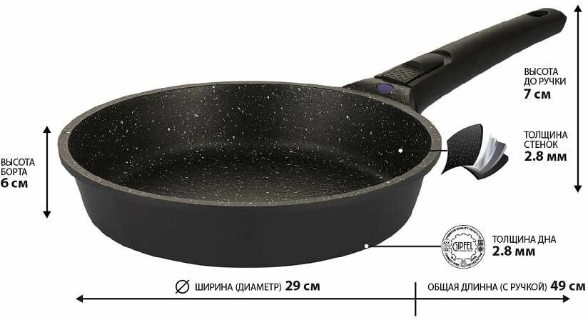 Сковорода GIPFEL Proofet 2485, 28см, съемная ручка, без крышки, черный