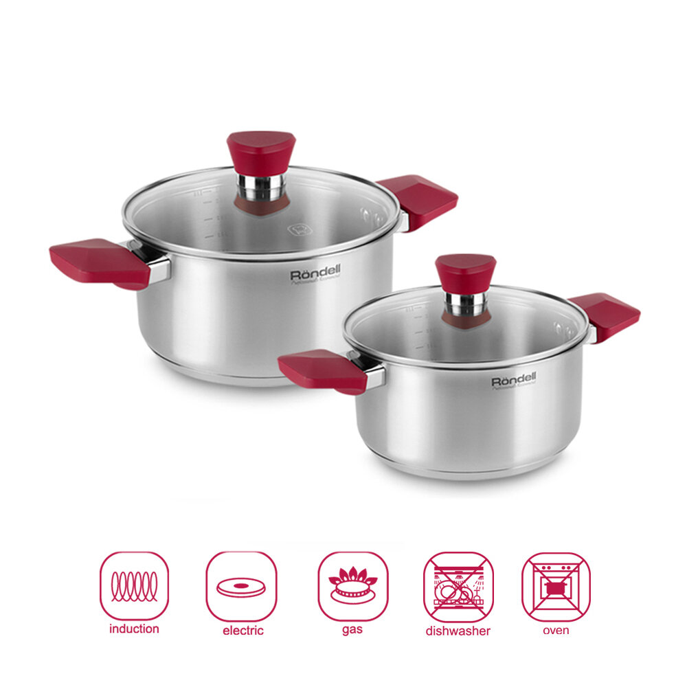 | Дополнительная информация | материал крышек: стекло, ободок крышки из нержавеющей стали против сколов и трещин; материал ручек: бакелит с силиконовым напылением; крепление ручек - клепочное; многослойное дно; мерная шкала: есть; диаметр кастрюль: 24 см, 20 см; диаметр индукционного диска 22 см, 18 см |