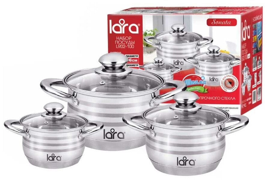 LARA Sonata LR02-100 кастрюли: 2.1/3.9/6.5л, стеклянные крышки