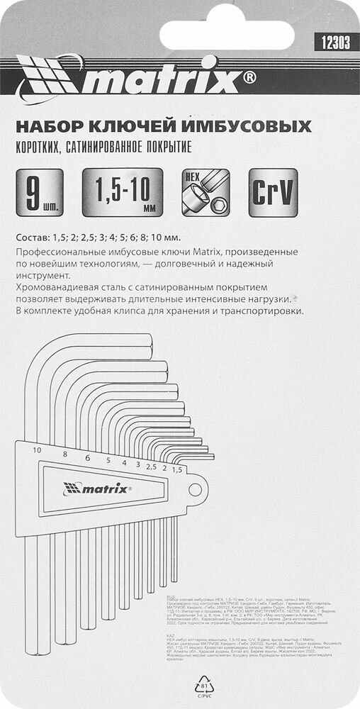 Набор ключей MATRIX 12303 имбусовых hex 1.5–10мм crv 9шт короткие сатин.
