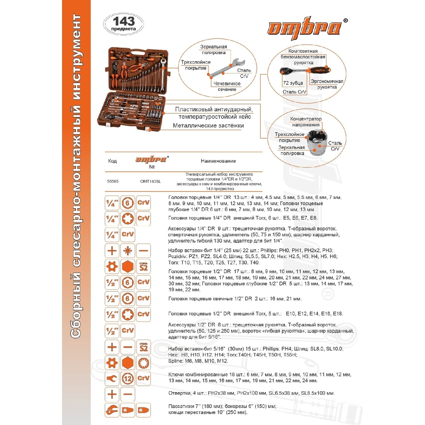 Sl Набор Инструмента Универсальный 1/4", 1/2"Dr, 143 Предмета OMBRA арт. OMT143SL
