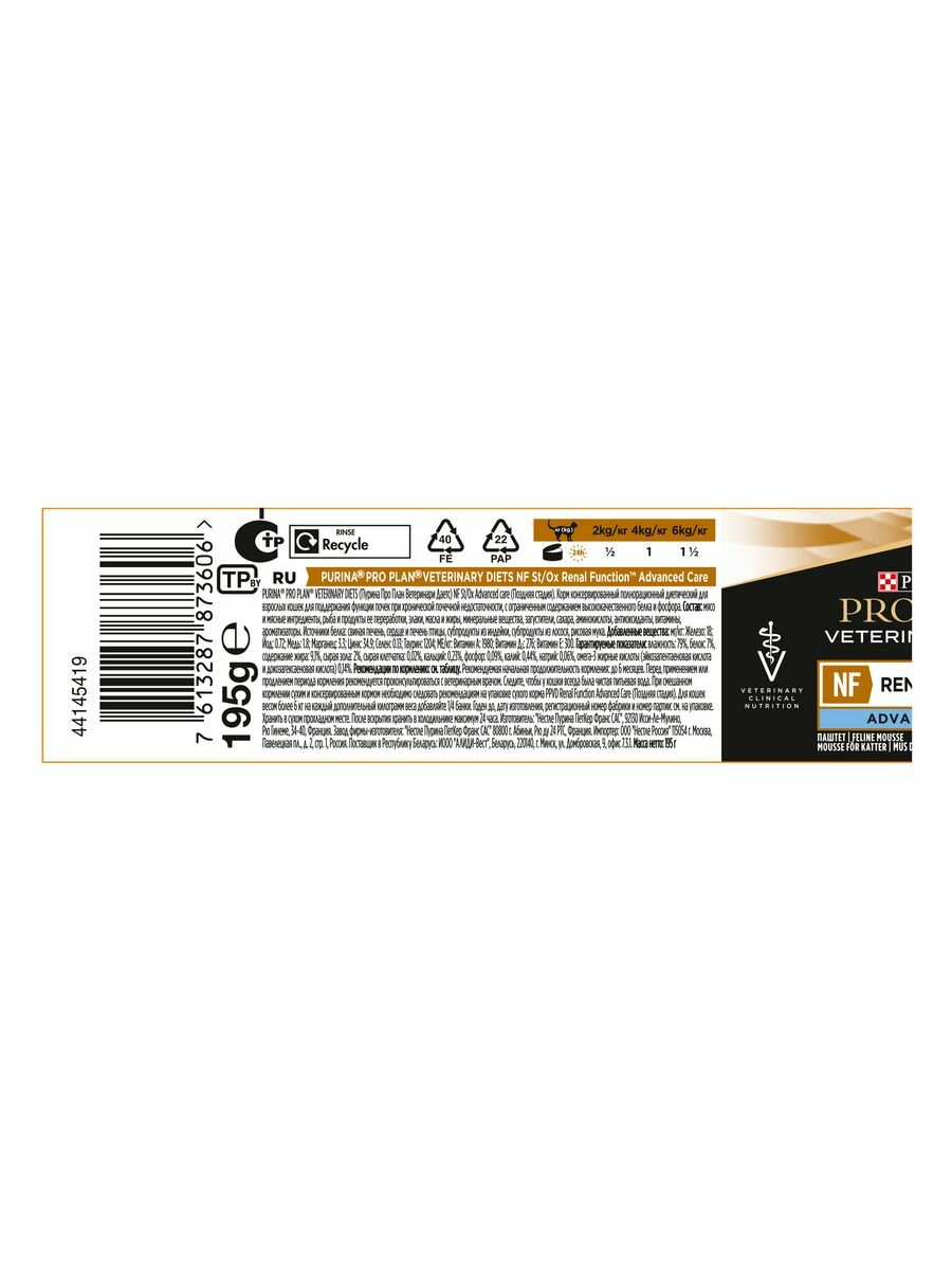 СохранитьВлажный корм для кошек Purina Pro Plan Veterinary Diets NF St/Ox RENAL FUNCTION Advanced Care, при поздней стадии почечной недостаточности, 24шт. х195г интересное: