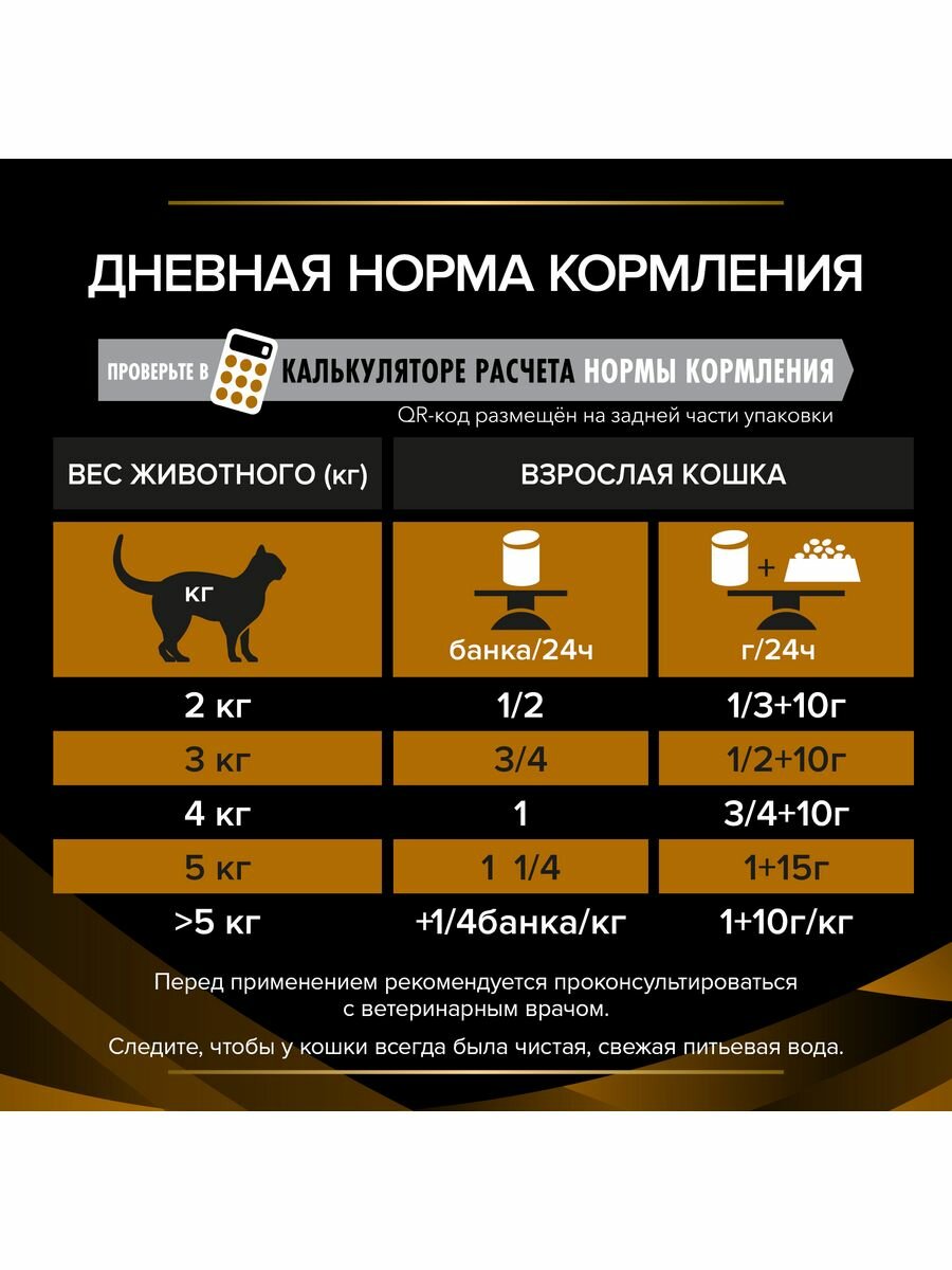 | Дозировка | Рекомендации по кормлению: см. таблицу. Рекомендуемая начальная продолжительность кормления: до 6 месяцев. Перед применением или продлением периода кормления рекомендуется проконсультироваться с ветеринарным врачом. Для кошек весом более 6 кг на каждый дополнительный килограмм веса добавляйте ¼ банки. |