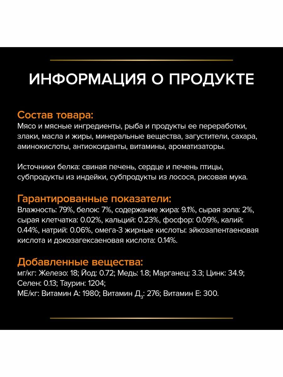 | Состав | Мясо и мясные ингредиенты, рыба и продукты ее переработки, злаки, масла и жиры, минеральные вещества, загустители, сахара, аминокислоты, антиоксиданты, витамины, ароматизаторы. Источники белка: свиная печень, сердце и печень птицы, субпродукты из индейки, субпродукты из лосося, рисовая мука. |