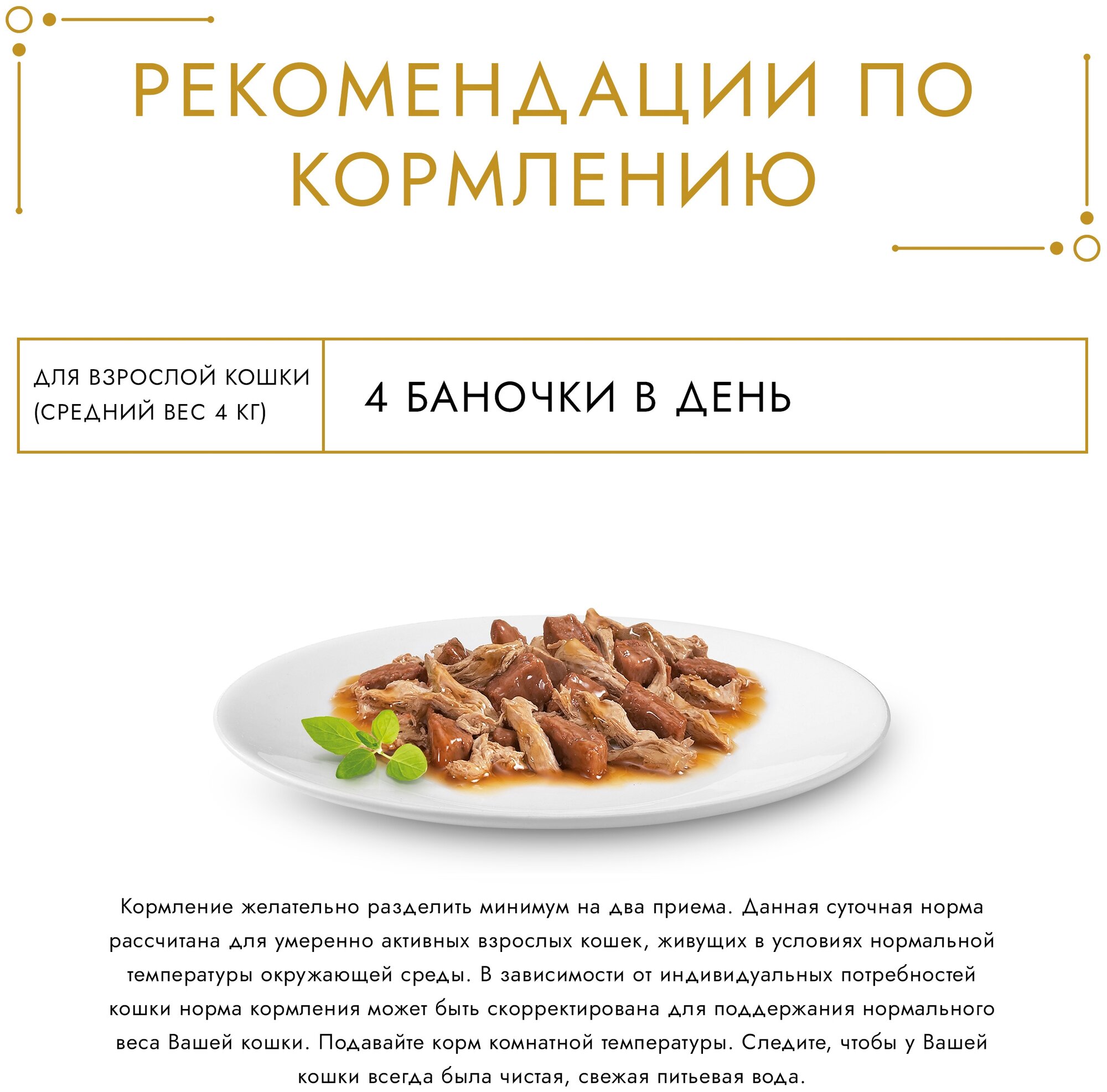 | Дозировка | 4 баночки в день для взрослой кошки (средний вес 4 кг), в несколько приемов |