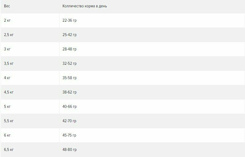 | Дозировка | - вес кошки 2 кг - 24-32 г - вес кошки 2,5 кг - 28-38 г - вес кошки 3 кг - 32-42 г - вес кошки 3,5 кг - 36-48 г - вес кошки 4 кг - 40-52 г - вес кошки 4,5 кг - 42-56 г - вес кошки 5 кг - 45-60 г - вес кошки 5,5 кг - 48-65 г - вес кошки 6 кг - 52-68 г - вес кошки 6,5 кг - 55-72 г |