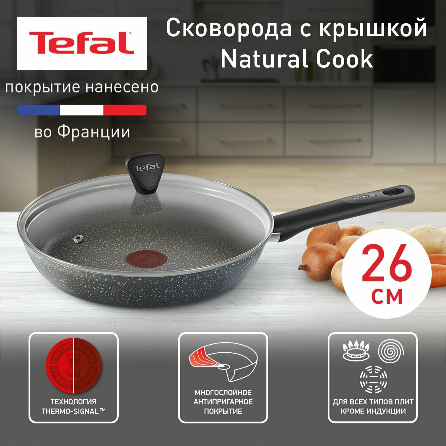 Сковорода с крышкой Tefal Natural Cook 04211926, диаметр 26 см, с индикатором температуры и антипригарным покрытием, для газовых, электрических плит
