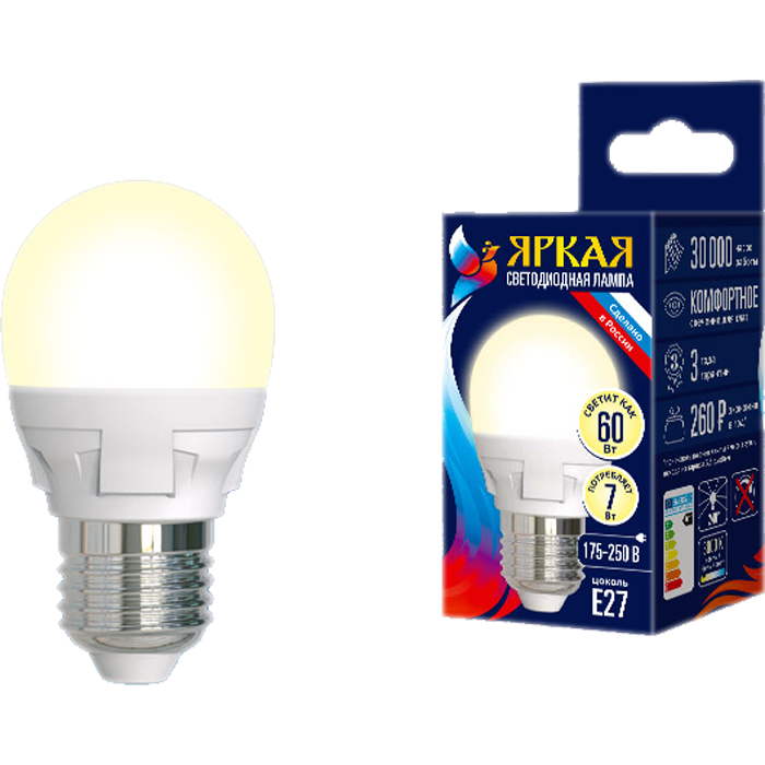 Лампы светодиодные Uniel LED-G45 7W/WW/E27/FR PLP01WH картон, цена за 1 шт