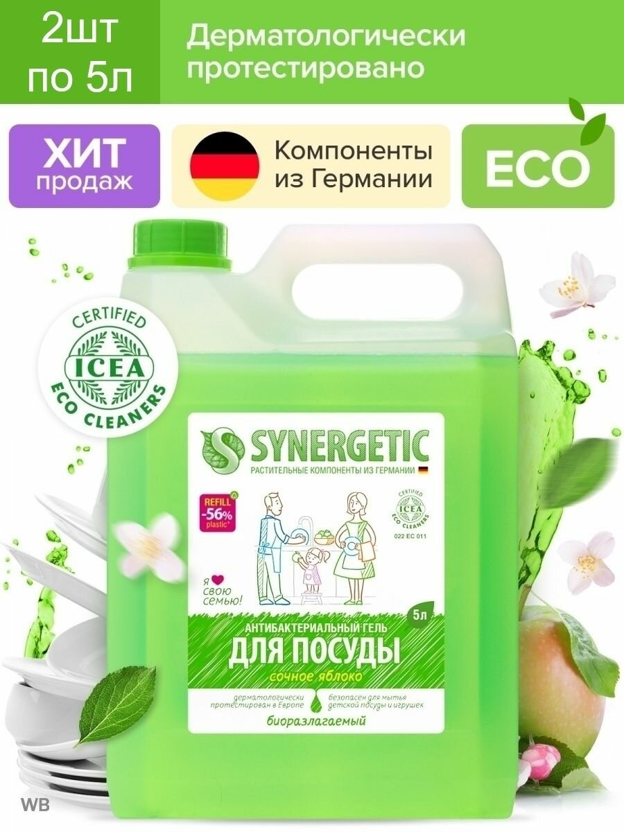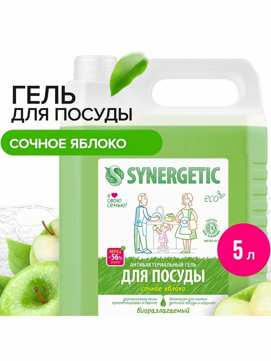 Купить Synergetic Антибактериальный гель для мытья посуды Сочное яблоко сменный блок, 5 л, 2 уп.