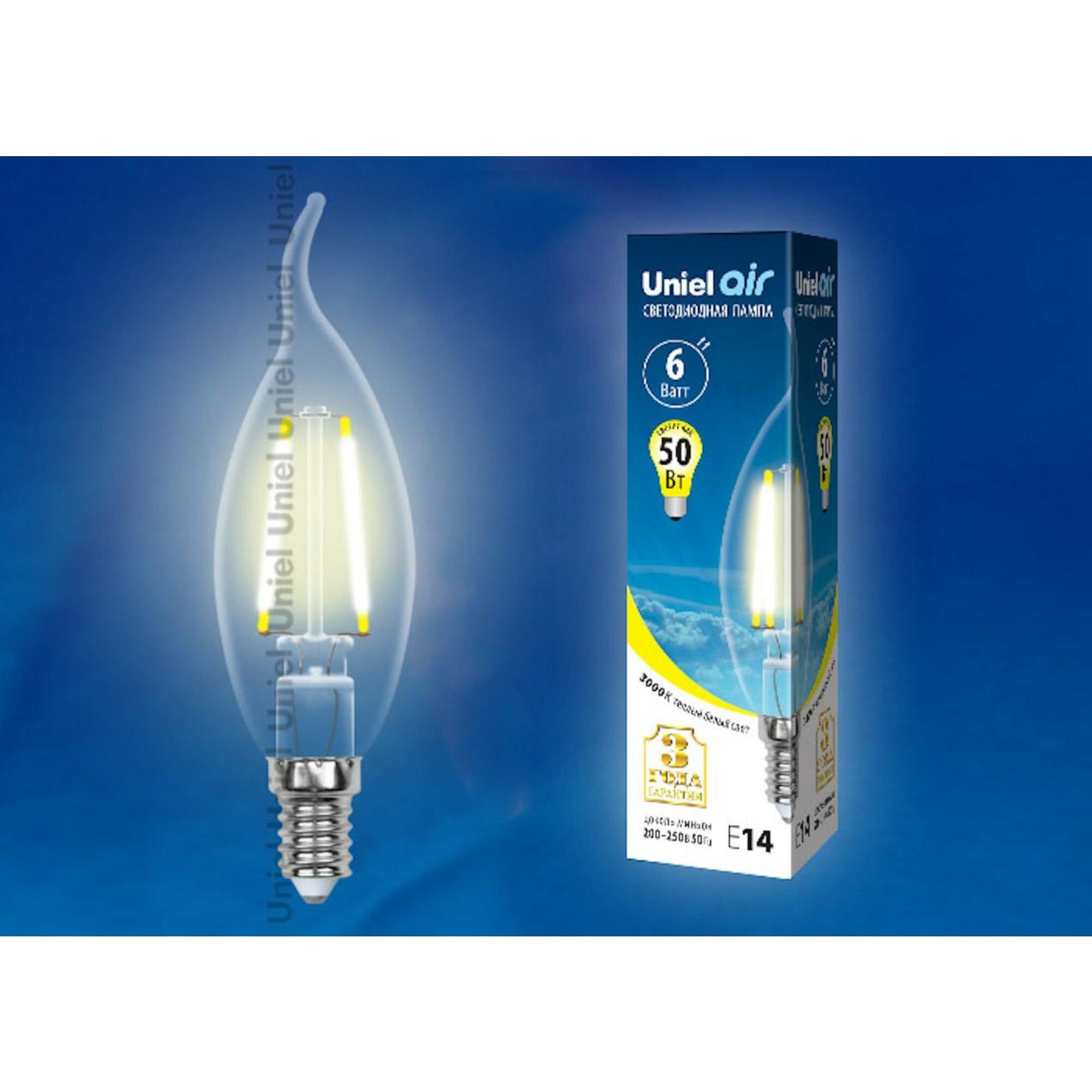 Светодиодная лампа Uniel LED-CW35-6W/WW/E14/CL GLA01TR Форма "свеча на ветру", прозрачная. Серия Air. Теплый белый свет (3000K). Картон. ТМ