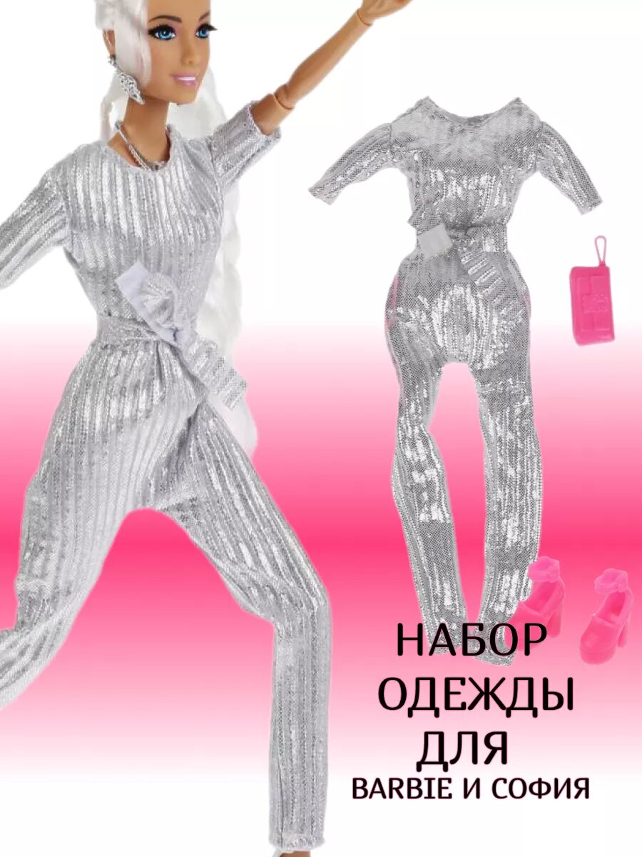 | В комплект входит | блестящий серебристый комбинезон, туфли, сумочка-клатч |