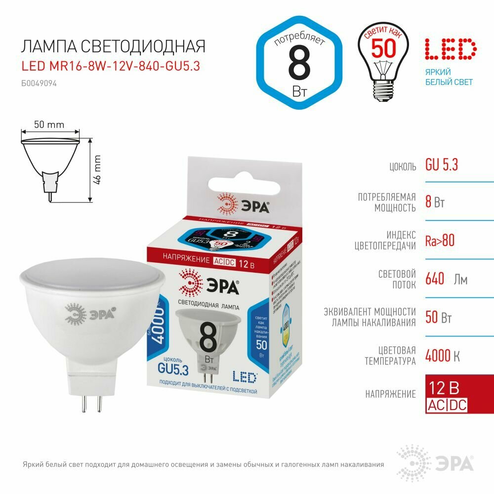 (12 шт.) Светодиодная лампочка ЭРА MR16 8Вт 12В 4000К GU5.3