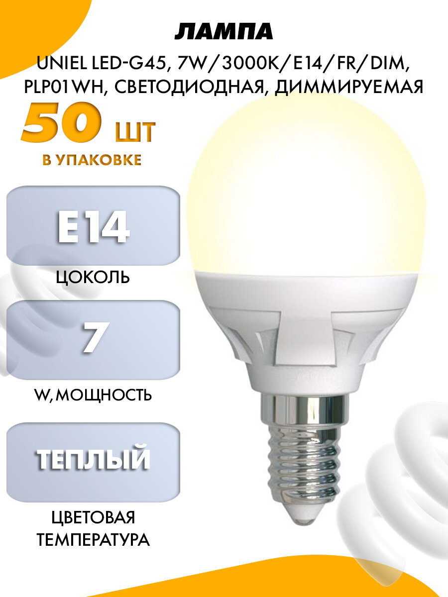 Светодиодная лампа UNIEL LED-G45 7W/3000K/E14/FR/DIM PLP01WH диммируемая. Форма «шар», матовая. Серия Яркая. Теплый белый свет (3000K). Картон. ТМ .