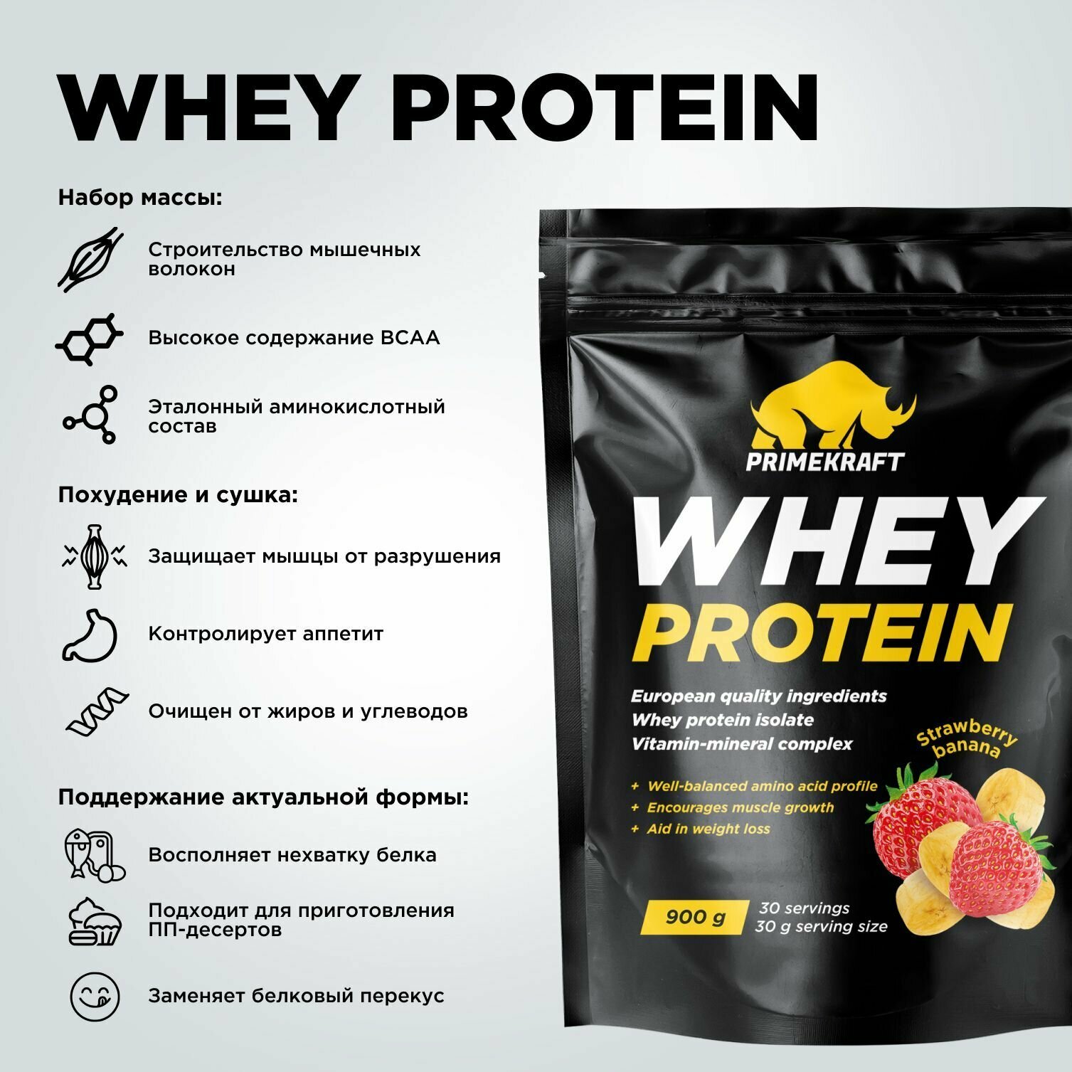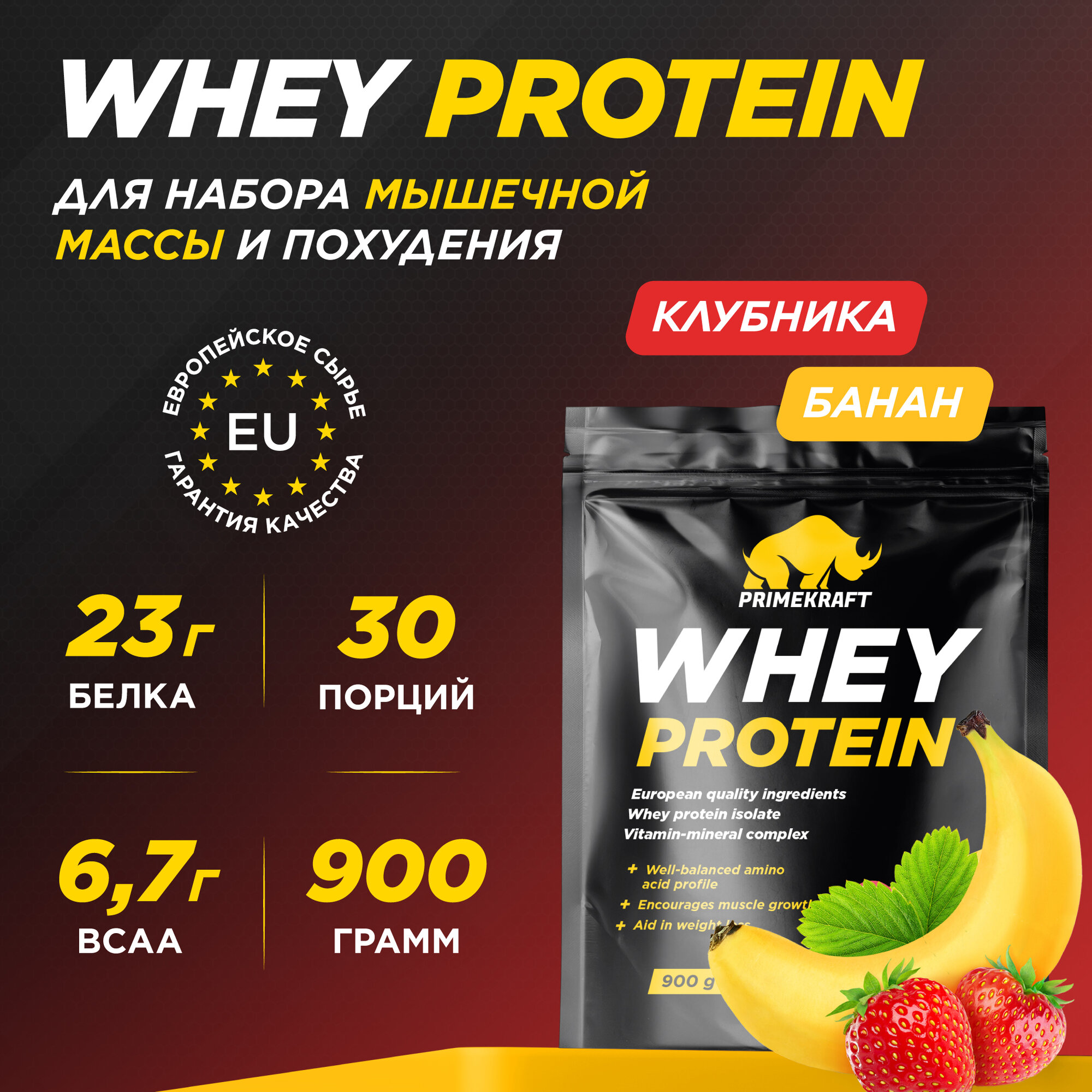 Протеин Prime-Kraft Whey 900г, вкус: клубника и банан