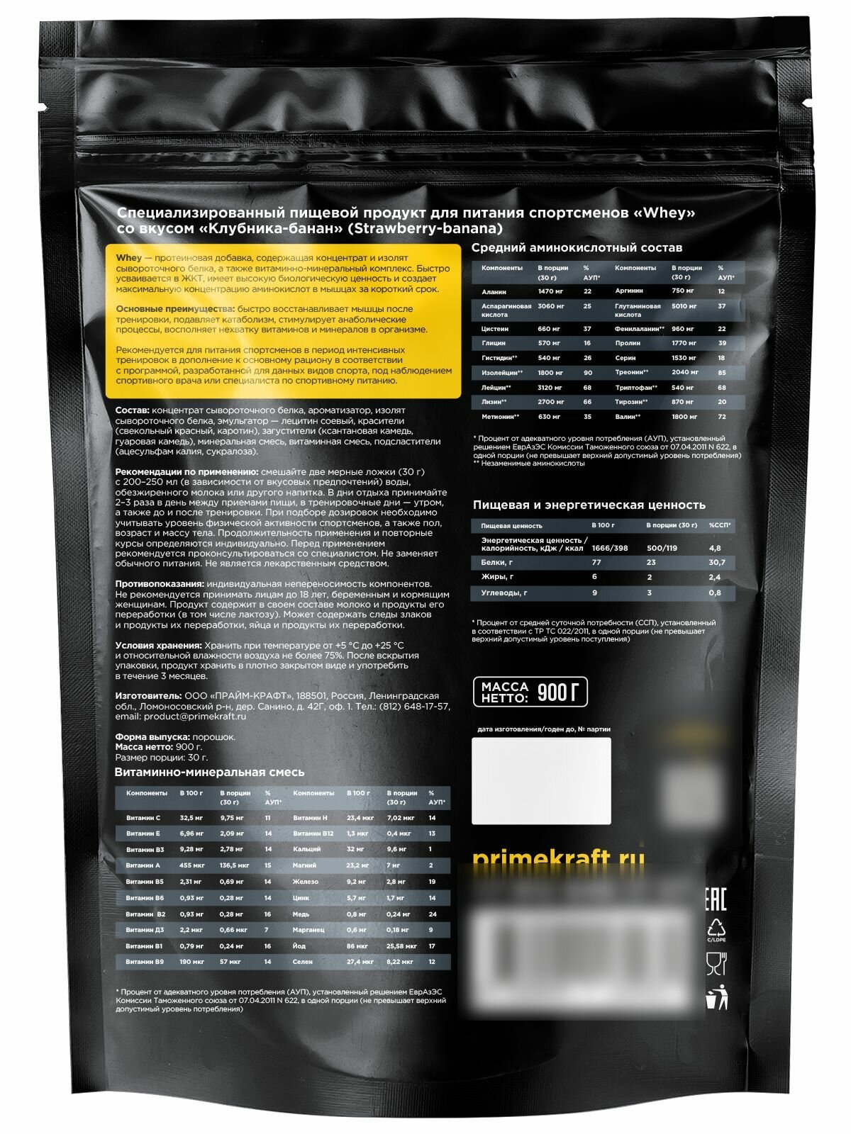 Протеин Prime Kraft Whey, 900 г с витаминами и минералами, Клубника-Банан 900 г