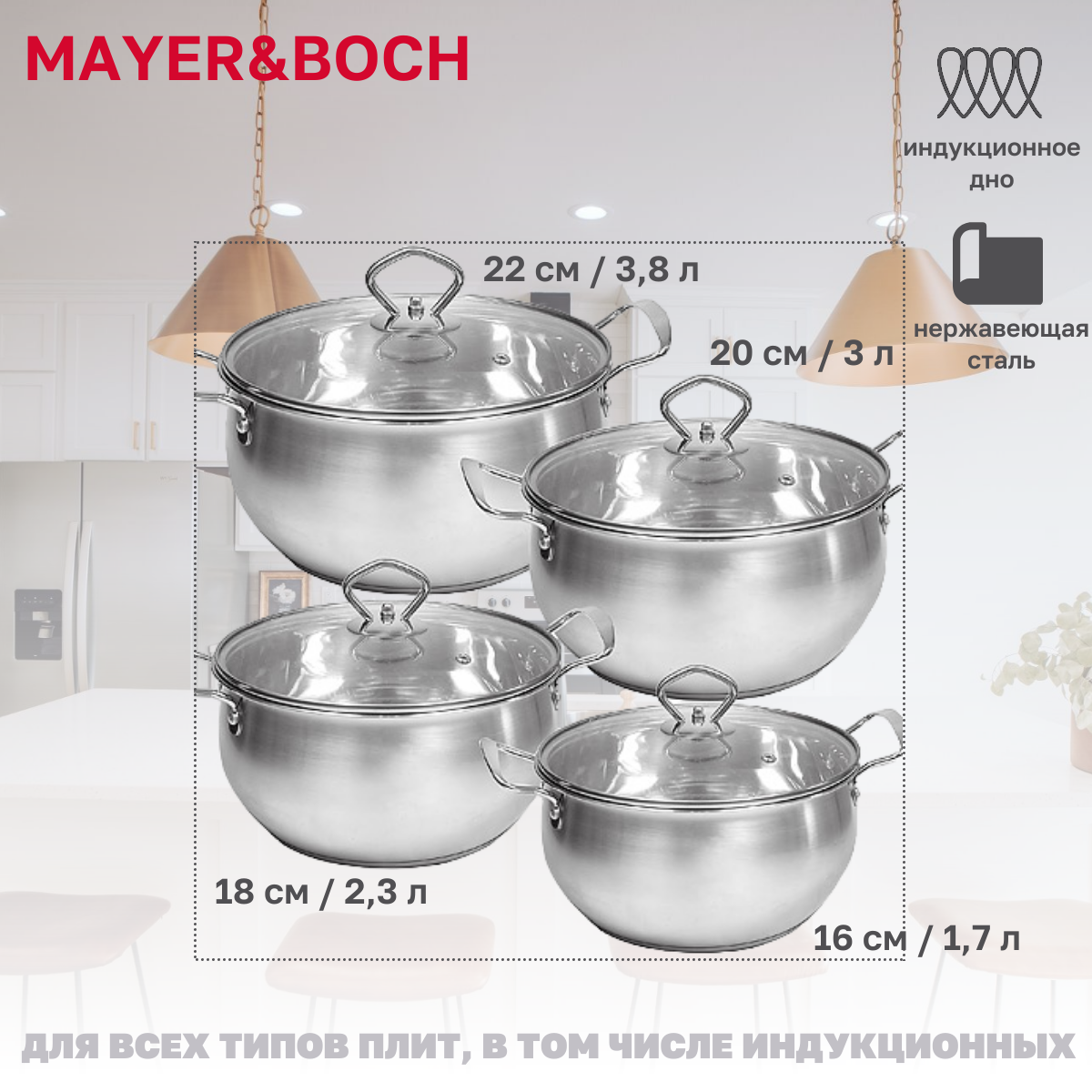 Mayer&boch 31004 Набор посуды 8пр 1,7+2,3+3,0+3,8 л MB (х8) .
