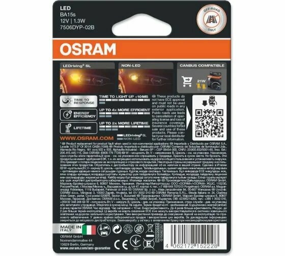 Лампа автомобильная Osram LEDriving SL P21W 12V-LED (BA15s) Amber 1.3W, бл.2шт 3 пок., 7506DYP-02B