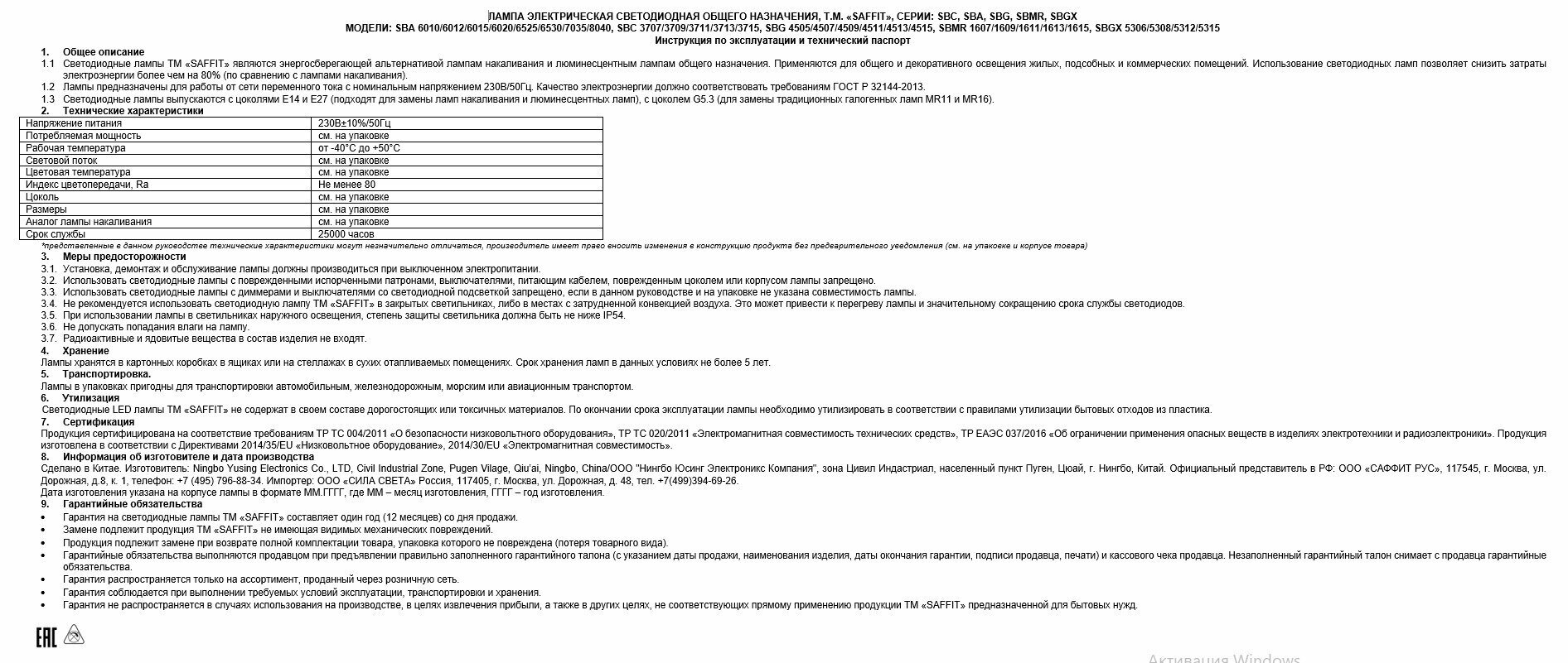 | Дополнительная информация | угол светового пучка 220 градусов, рабочая температура -40°C - +50°C |