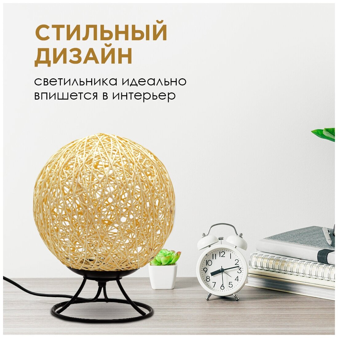 Светодиодный ночник из ротанга с теплым свечением для интерьера детской или спальни / Компактная ночная лампа в виде шара с плетёным абажуром