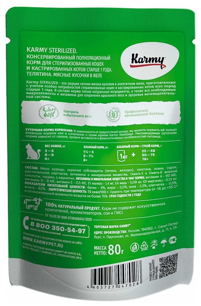 Купить Корм Karmy Sterilized (в желе) для стерилизованных кошек, с телятиной, 80 г x 24 шт